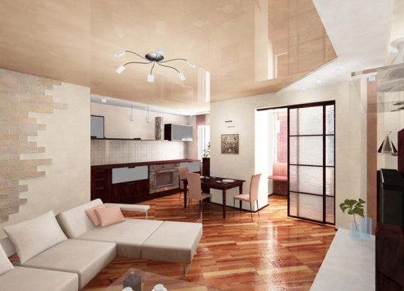 Usando correctamente os accesorios, tamén se pode conseguir diferenciación visual da sala de estar e da cociña. Por exemplo, sobre a superficie de traballo da cociña pode usar iluminación brillante e na sala de estar - luz silenciada.